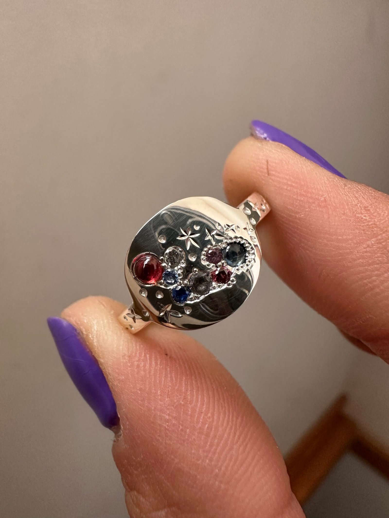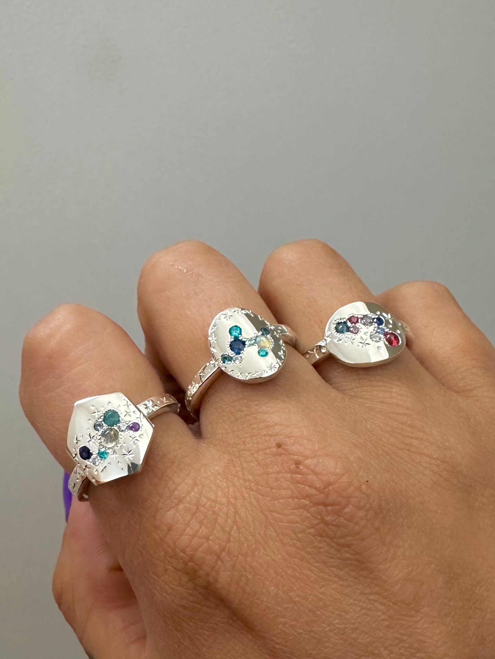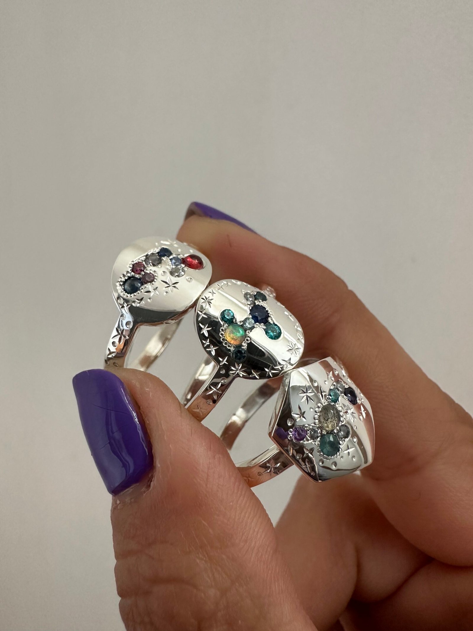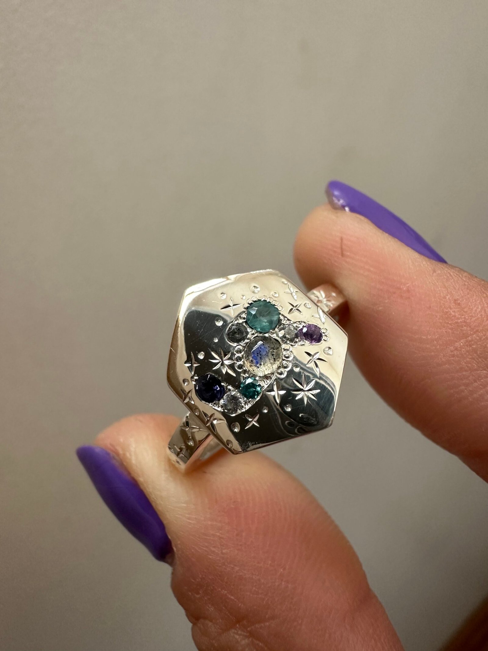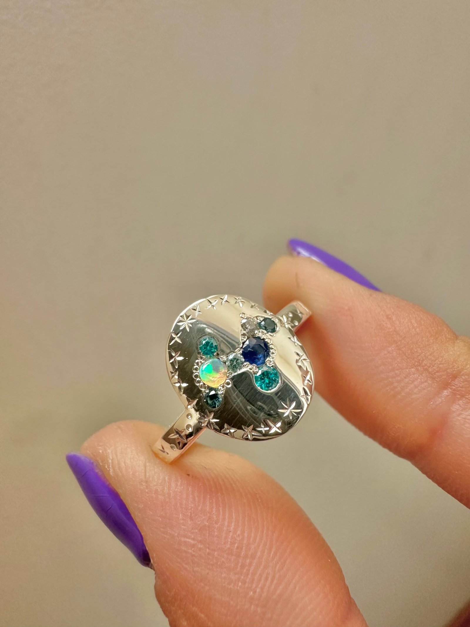 Talla 17 hexagonal Grandidierita, Moissanita, labradorita, amatista, zafiro , Talla 15.5 Oval zafiro rojo y azul, Moissanita, zafiro rosa, Talla 14.5 Oval ópalo, zafiro, circones mint, Moissanita , Mi Combi
